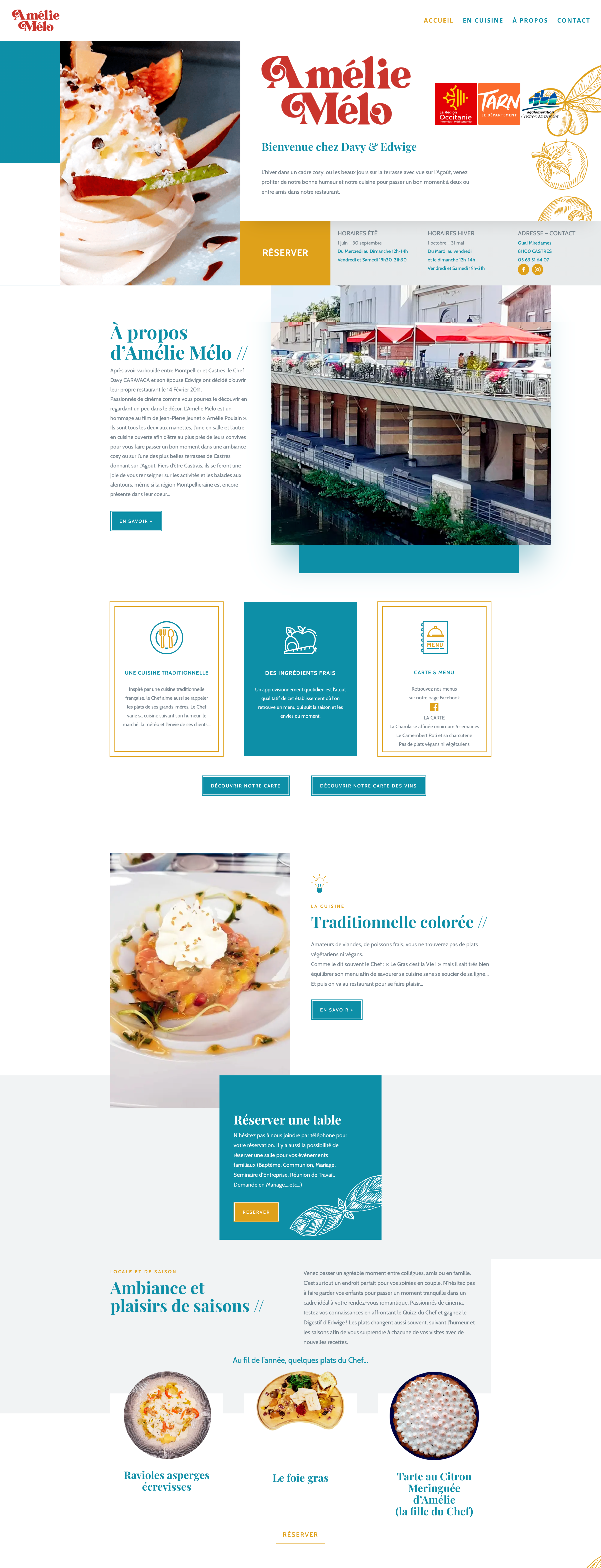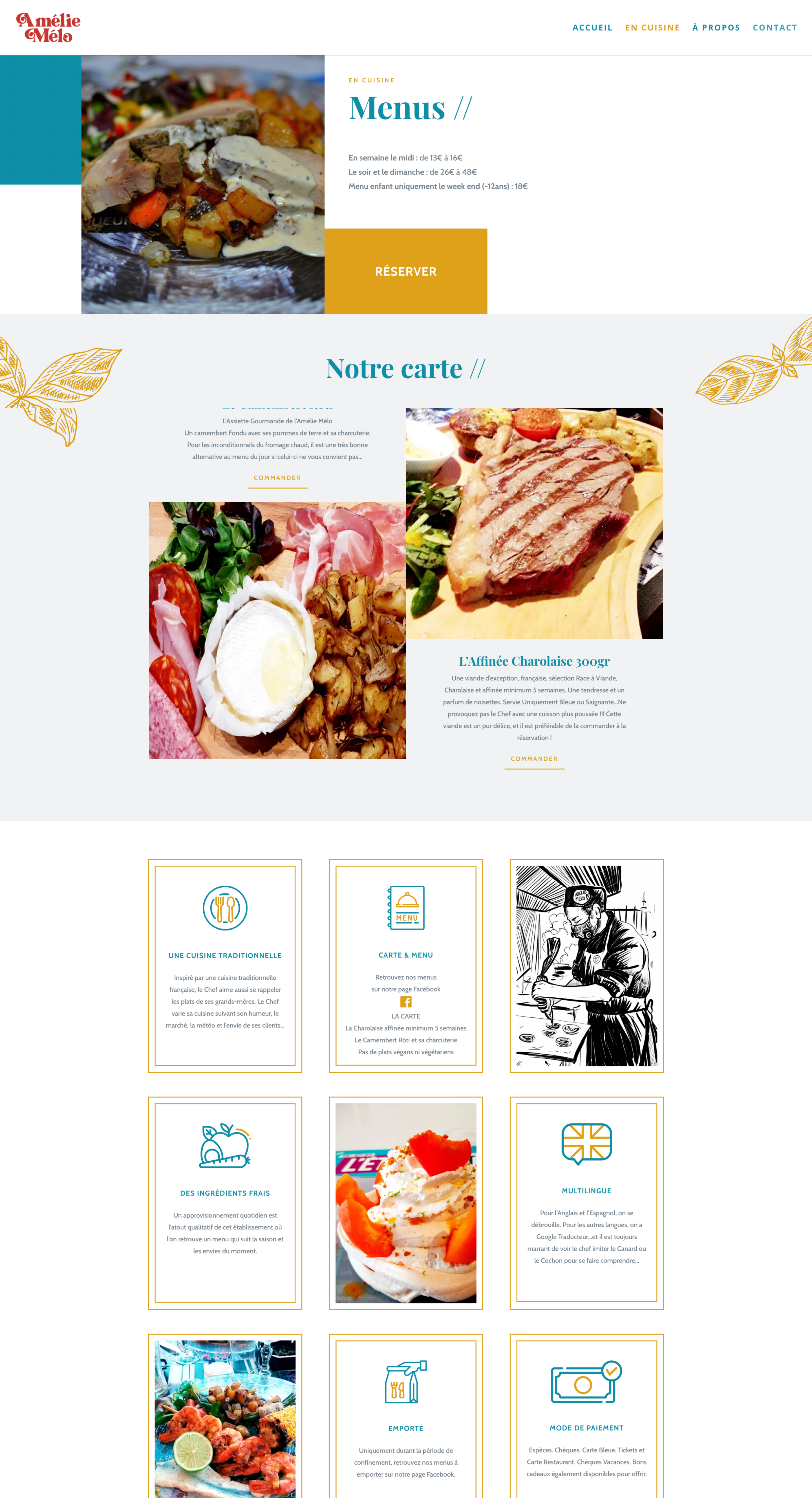 En agence, j’ai pris en charge la création complète du site internet pour le restaurant Amélie Mélo. Ma mission comprenait le développement de la maquette initiale, la conception des pages et des fonctionnalités, ainsi que le montage final du site sur la plateforme WordPress. Mon objectif était de fournir à Amélie Mélo une présence en ligne attrayante et fonctionnelle, reflétant l’ambiance et le style du restaurant.