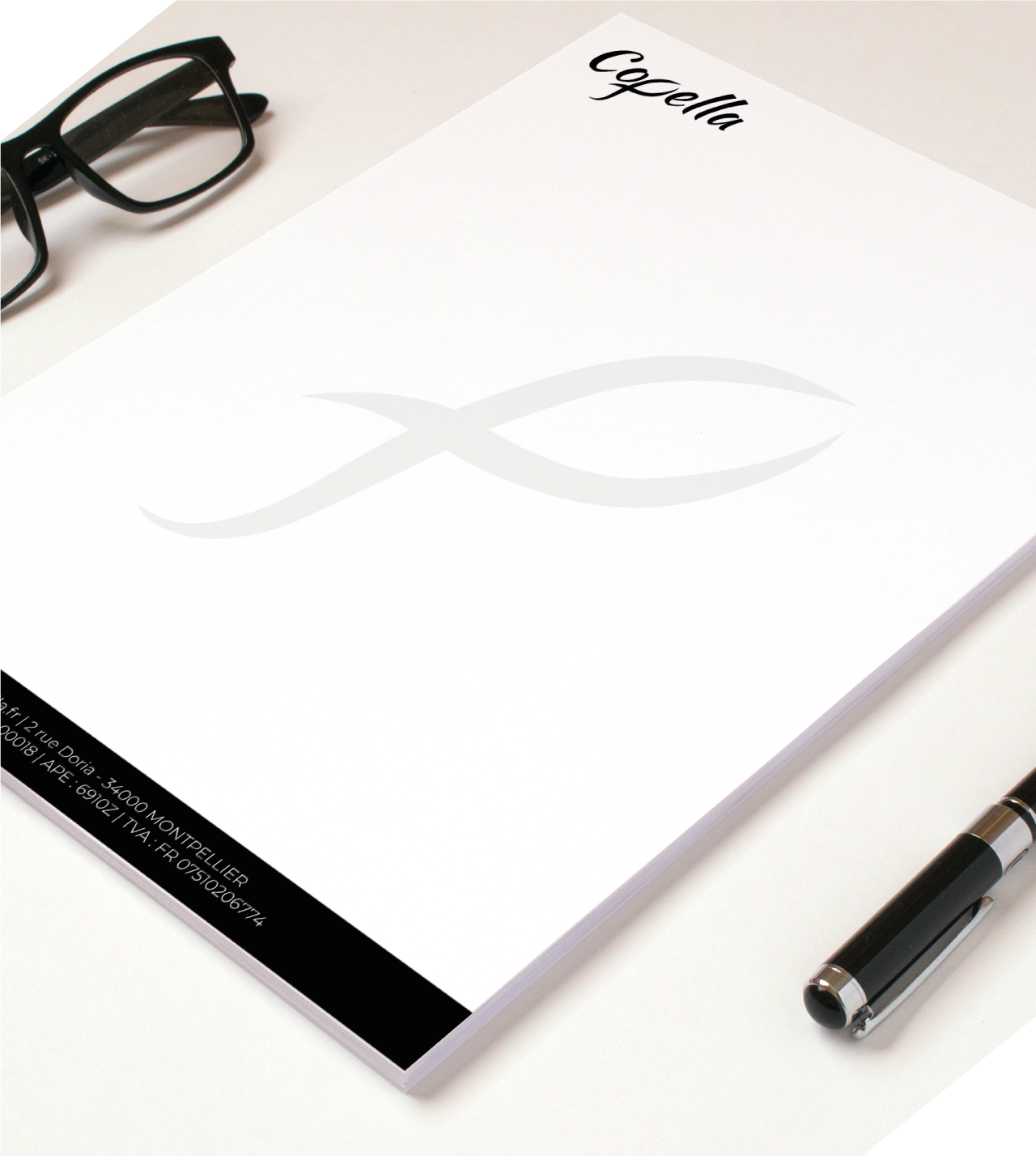 En tant que créatrice, j’ai pris en charge chaque détail de l’identité de Copella. Du choix du nom jusqu’à la conception du logo, j’ai veillé à ce que chaque élément reflète parfaitement l’image recherchée. Le logo, notamment, met en avant une typographie raffinée, accompagnée d’un « P » stylisé en forme de poisson, clin d’œil subtil au nom de l’avocate.